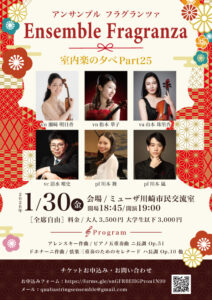 バイオリン講師の砂原先生と大田先生、ビオラ講師の田口先生、チェロ講師の清水先生出演の演奏会のご案内です。是非お越しください。 日 時 2026年1月16日(金) 開場 / 開演 18:45 / 19:00 会 場 〒21 […]